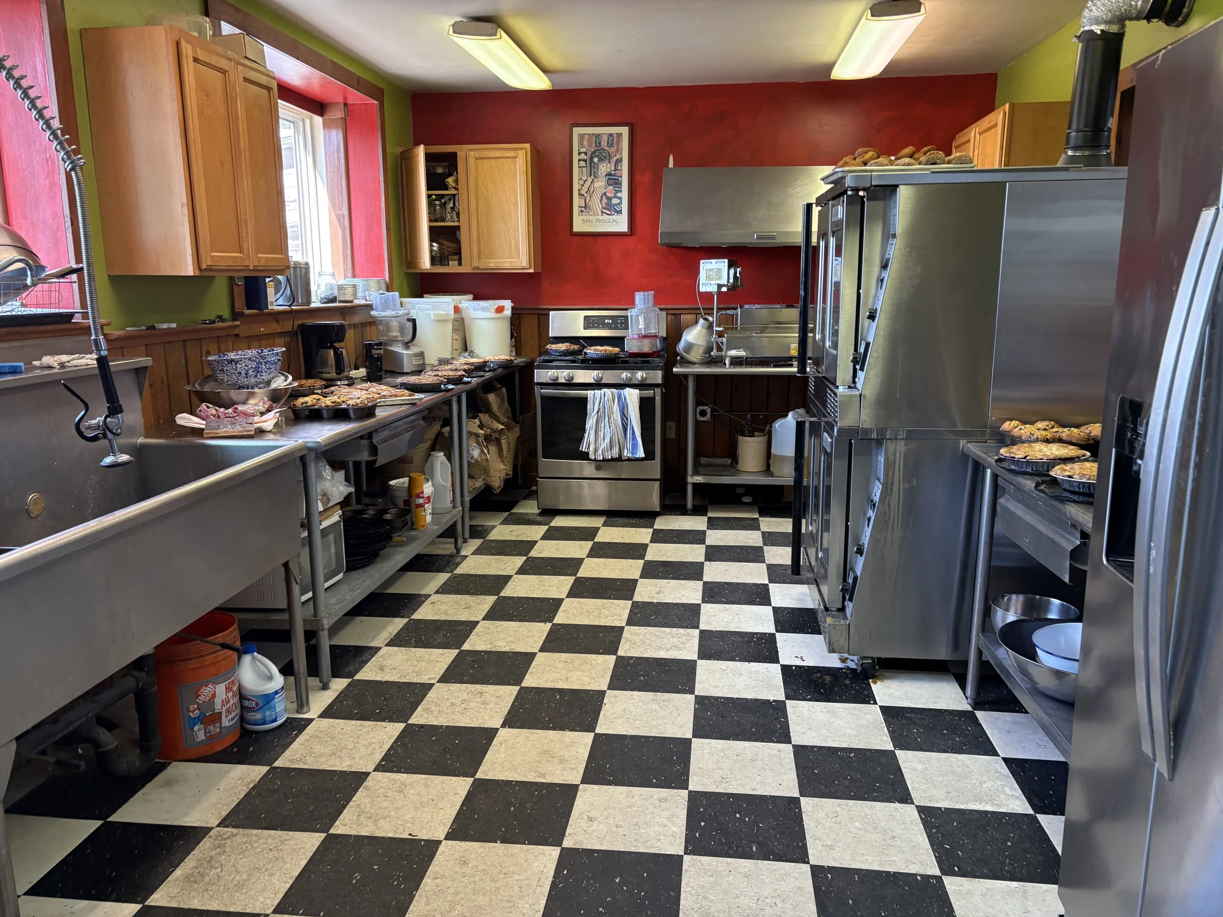 The kitchen at Green Mountain Orchard: checkerboard tile, red walls, stainless steel accoutrements, and SO MANY PIES. I wish you could smell it!