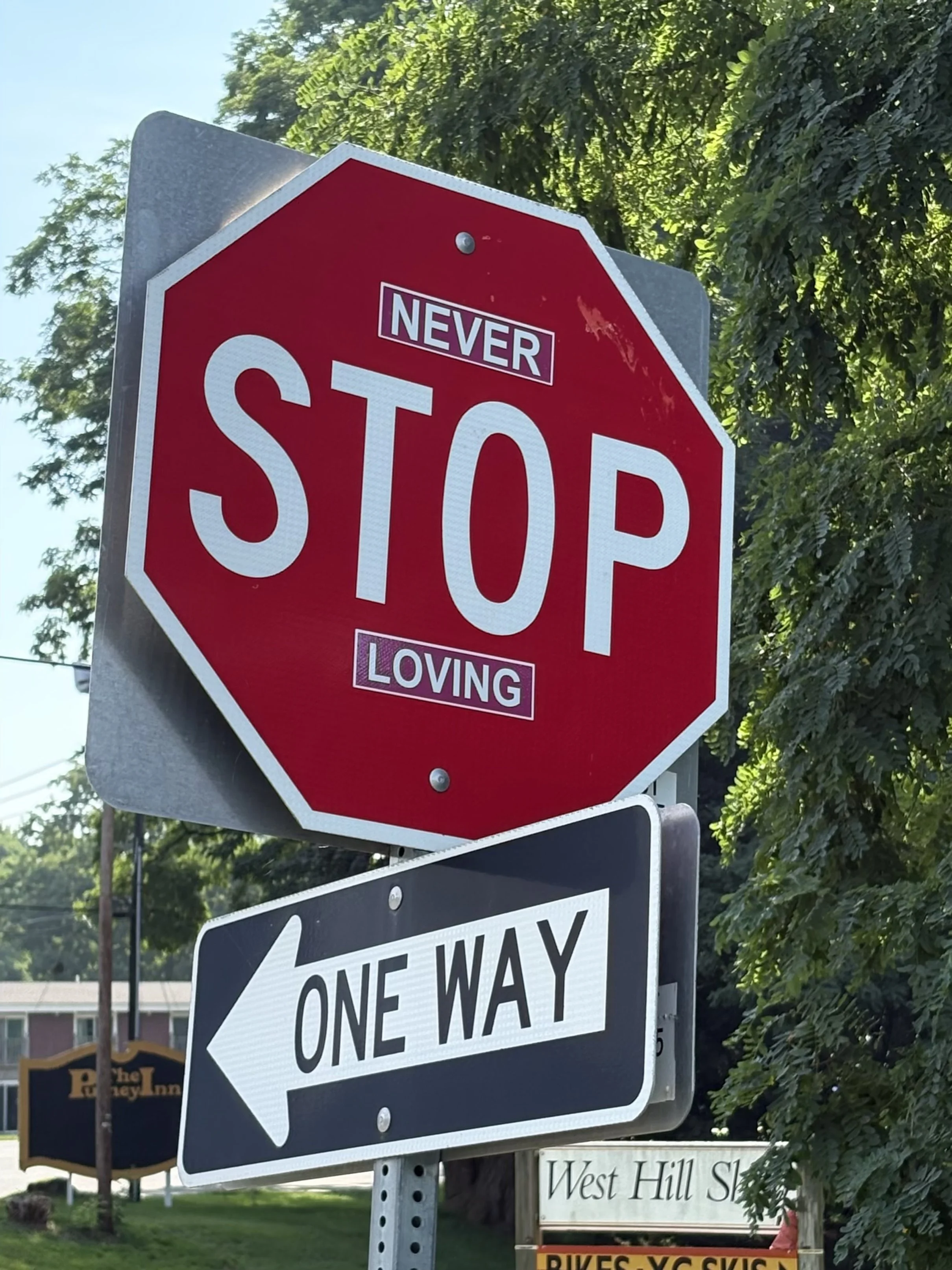 I’m writing this on August 17, which happens to be our wedding anniversary ~ our 29th this year. That’s not a milestone number in any standard way, but I’ve always had a fondness for prime numbers, so it feels significant all the same. And to celebrate, Tristan and I drove to Putney for an early morning session of blueberry picking at Green Mountain Orchard, which was just the right thing for my spirit. As we exited the interstate, I noticed that someone had adorned the stop sign with two words … NEVER and LOVING, above and below the word STOP. And below the stop sign, one more sign: ONE WAY.